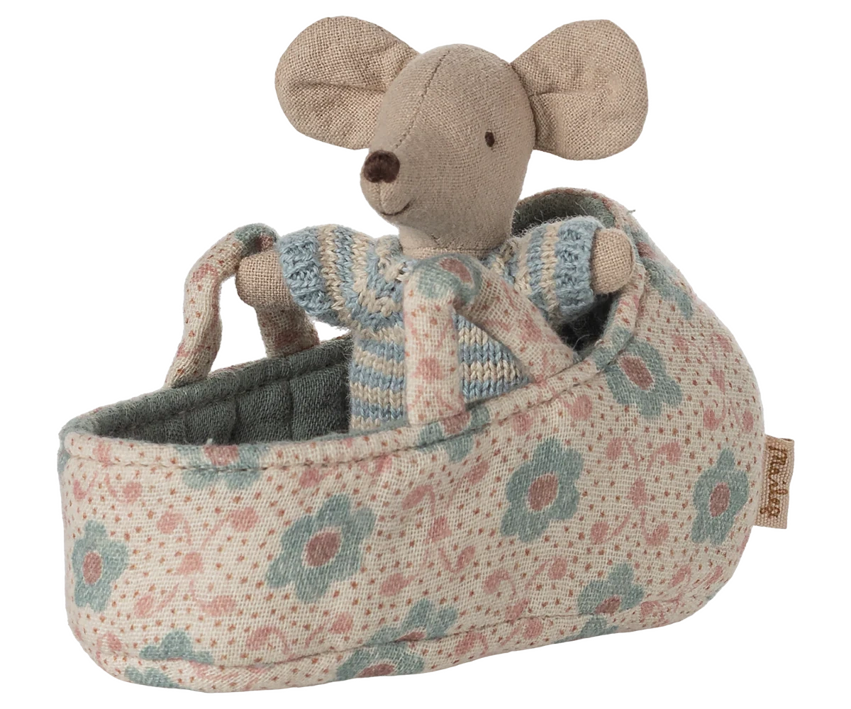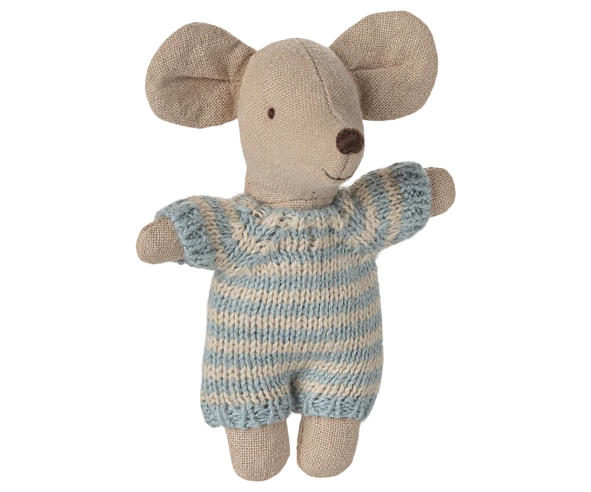 Mała myszka w miękkim, prążkowanym ubranku z dzianiny. Śpi godzinami w swojej małej, pikowanej gondoli.