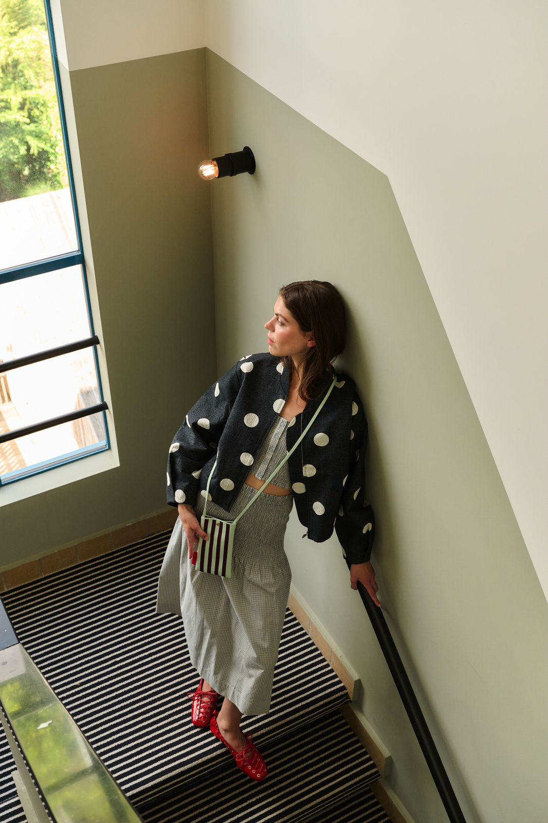 Idealna, gdy nie musisz zabierać ze sobą wielu rzeczy. Włóż telefon do tego uroczego, pasiastego woreczka, zamknij go magnesem i gotowe!