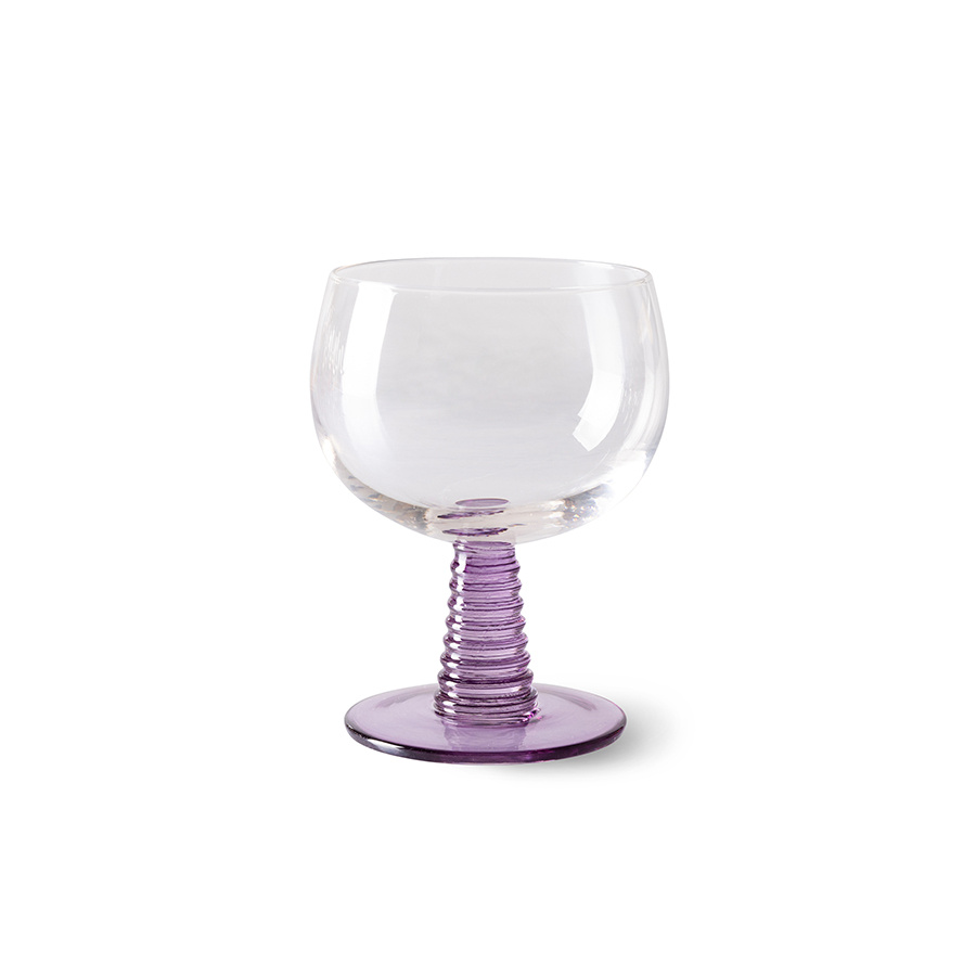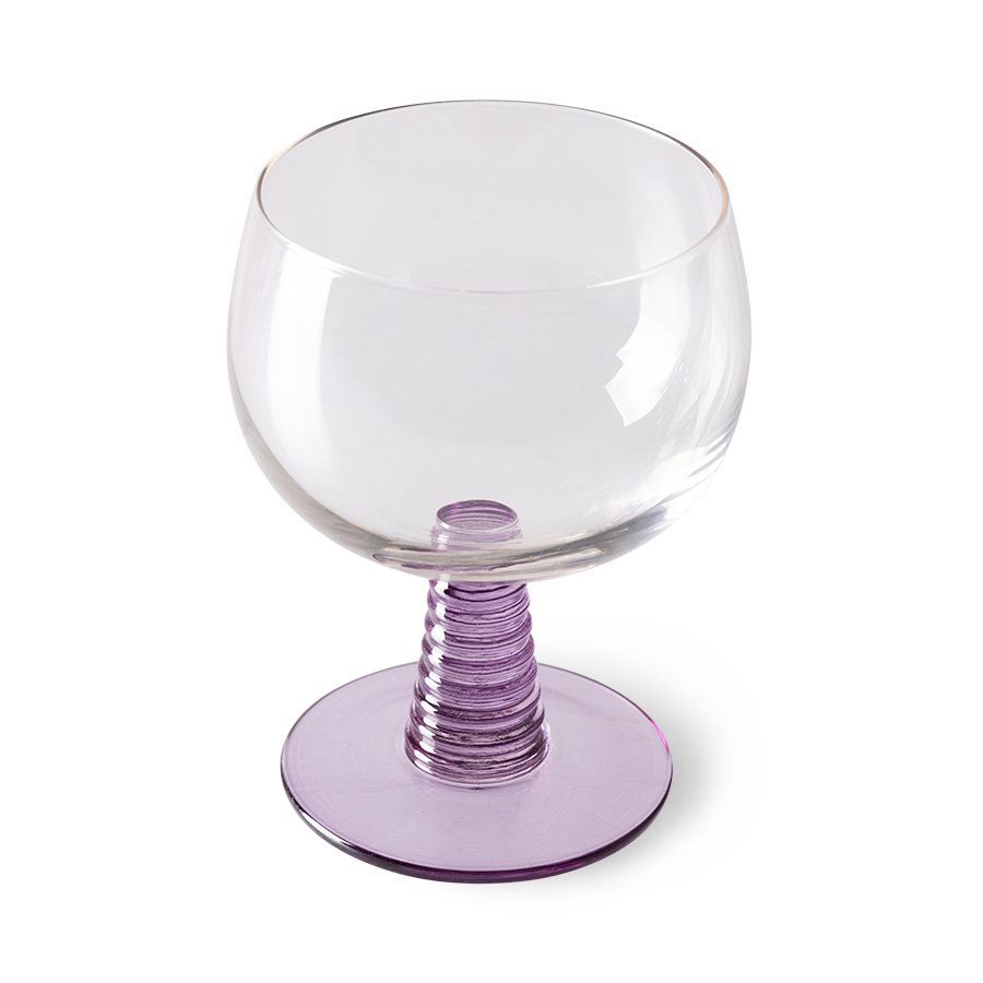 Ręcznie dmuchany kieliszek do wina o niskim zawirowaniu i solidnej, fioletowej szklanej podstawie. Wyróżnia się od razu i nadaje kieliszkowi zabawny wygląd. Dzięki temu możesz jeszcze bardziej delektować się winem lub innym drinkiem.