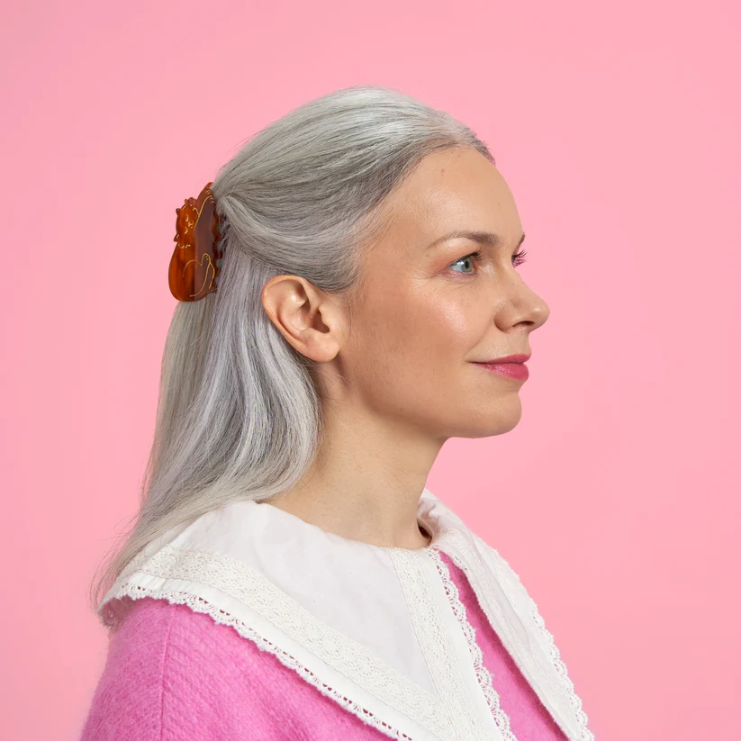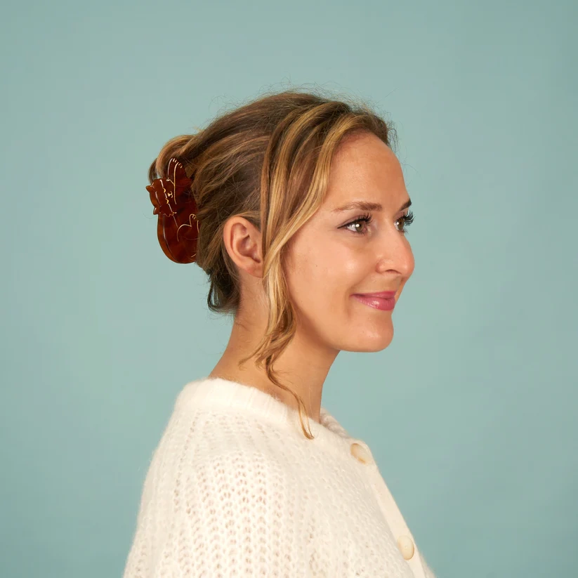 Najsłodsze z brązowych kotów, przyłapane na drzemce z wyciągniętymi łapkami i niegrzecznym uśmiechem. Ta kocia spinka do włosów czeka, by zwinąć ją w kok i zasłużony odpoczynek.
