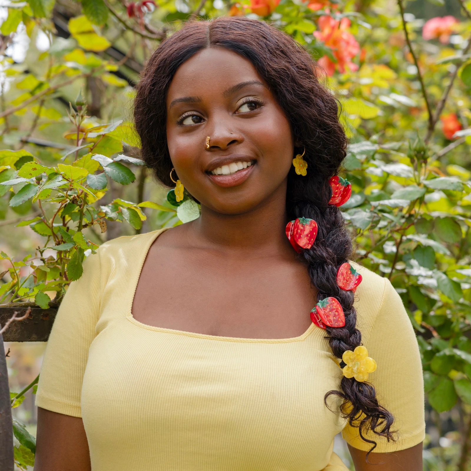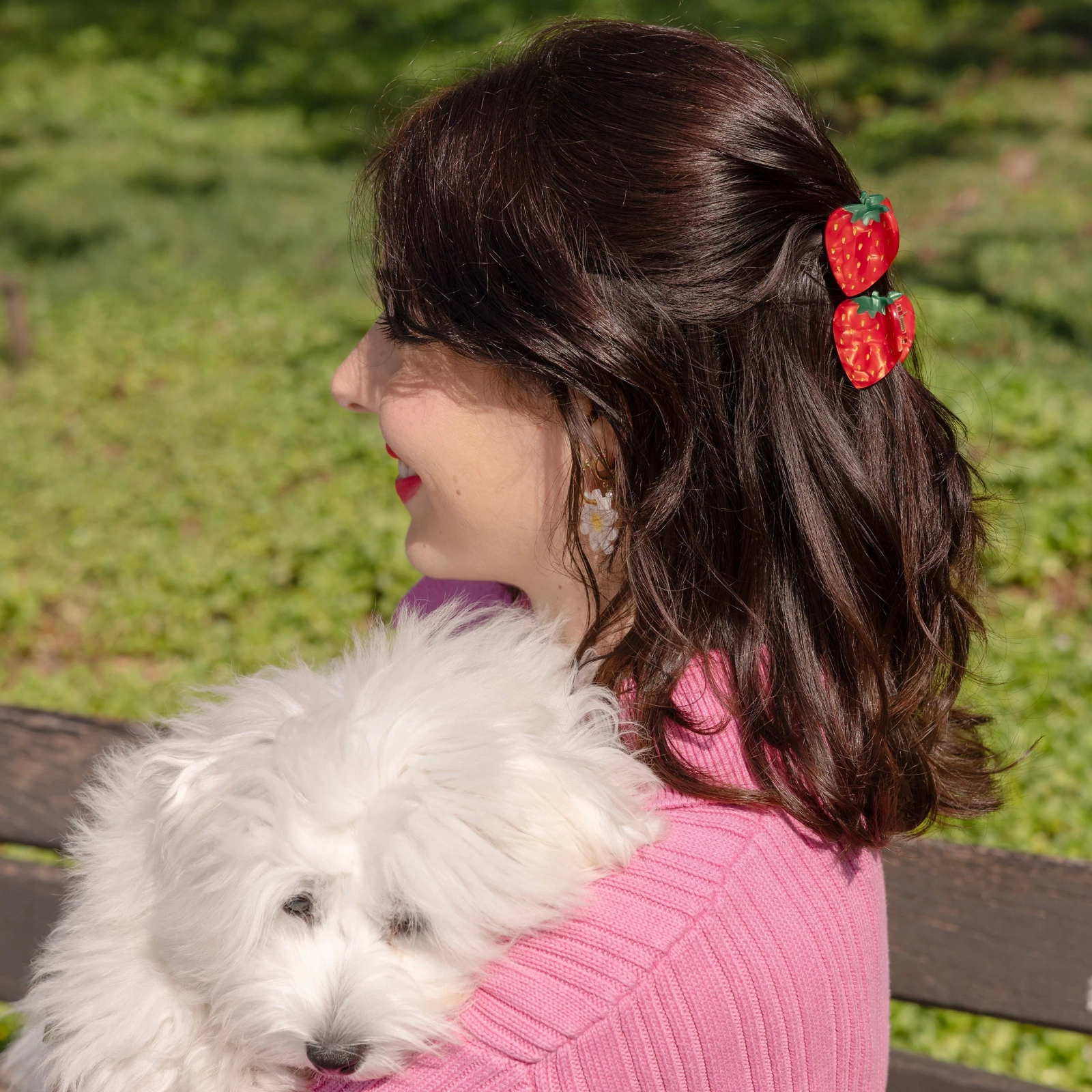 Smakowita, mała truskawka z błyszczącego octanu, z uroczymi, złotymi zdobieniami. Idealny dodatek sezonowy, który odświeży każdą fryzurę wiosną i latem. Dla świeżego i kolorowego looku na targu lub na kolejnym pikniku!
