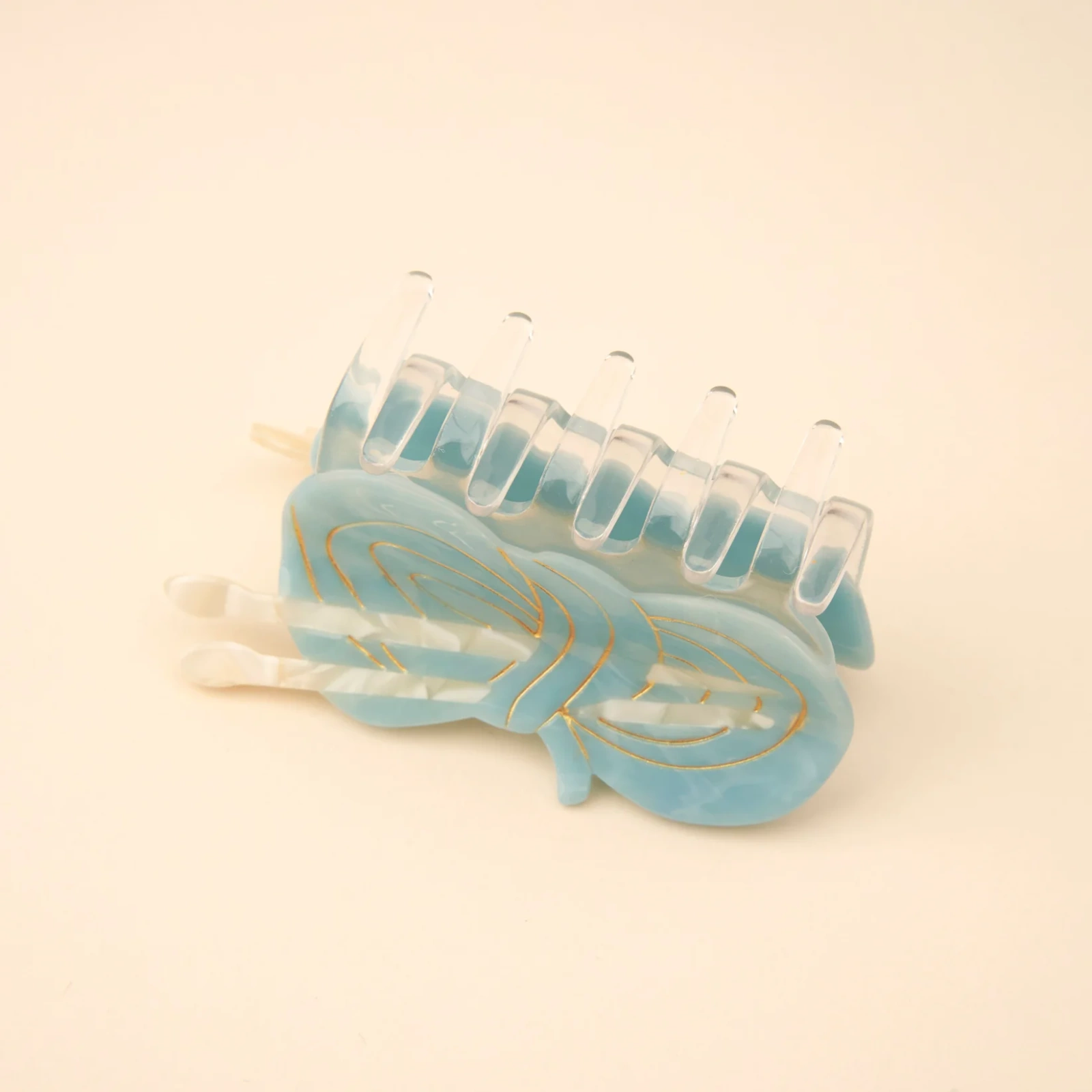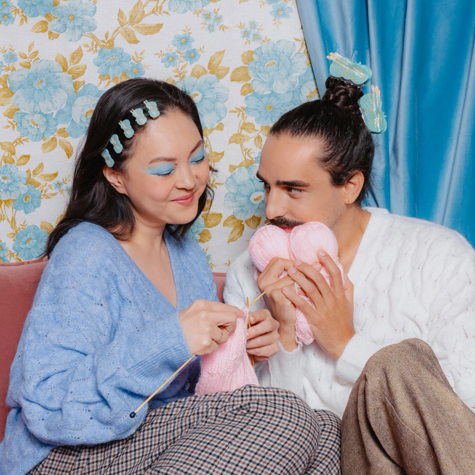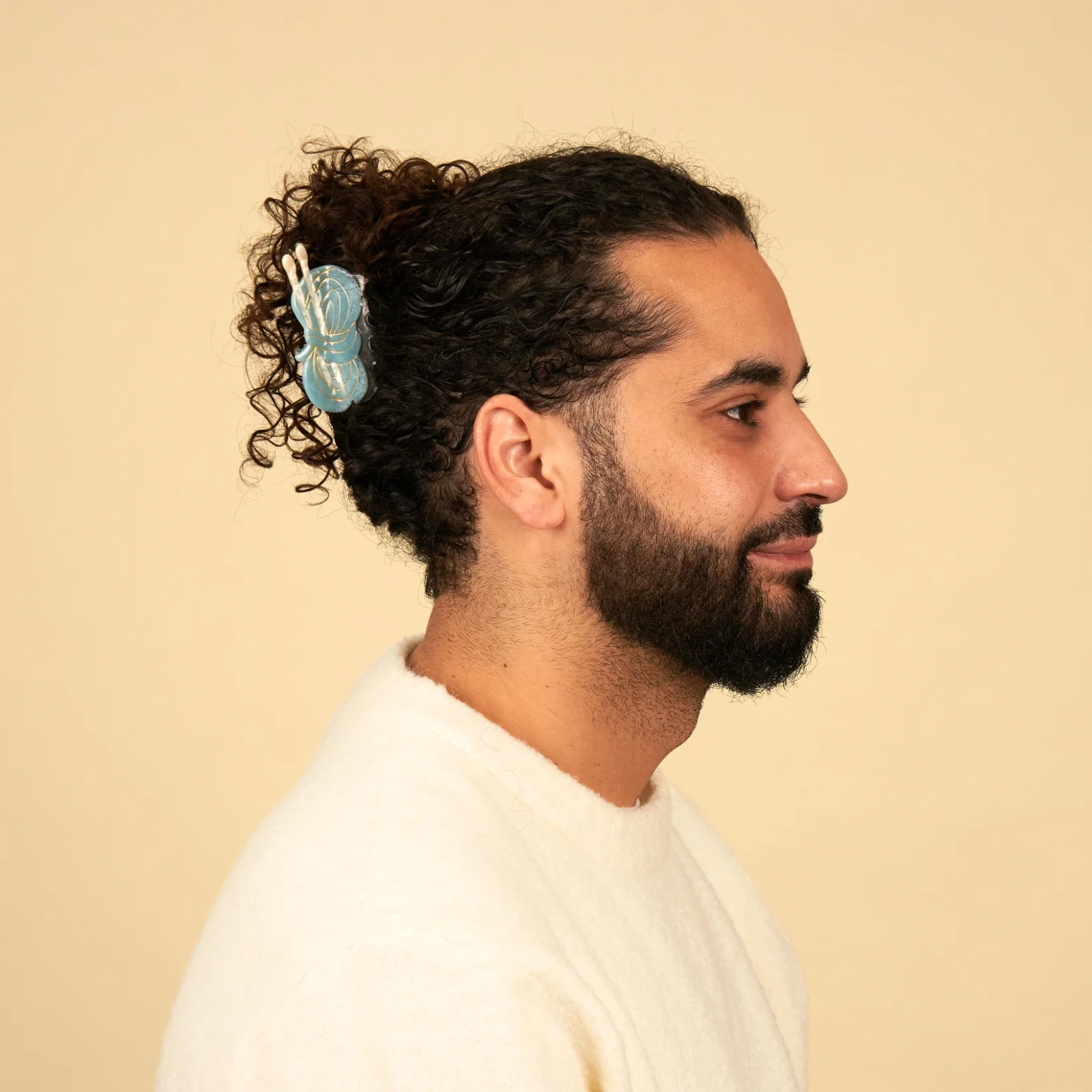 Dzierganie, które było ulubionym hobby naszych babć, powróciło, ku naszej wielkiej radości! Świętujemy naszą pasję z tą błękitną, wełnianą spinką z drucikami w kolorze kości słoniowej. Mały klejnot oryginalności, który idealnie chwyta długie, gęste włosy.