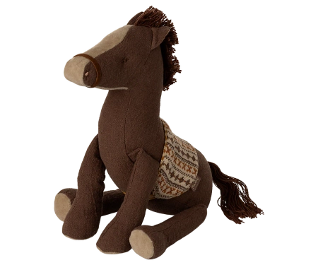 Brązowy kucyk jest wykonany z miękkiej bawełny/lnu. Grzywa i ogon wykonane są z bawełnianych sznurków, a siodło z miękkiej dzianiny, która gwarantuje komfort jazdy.
