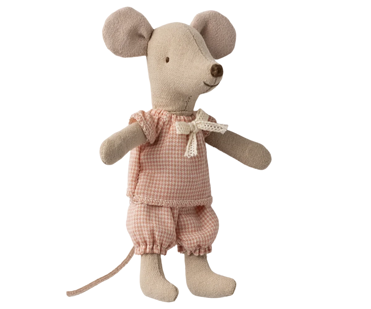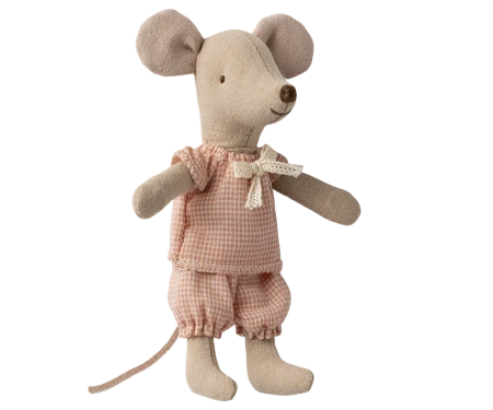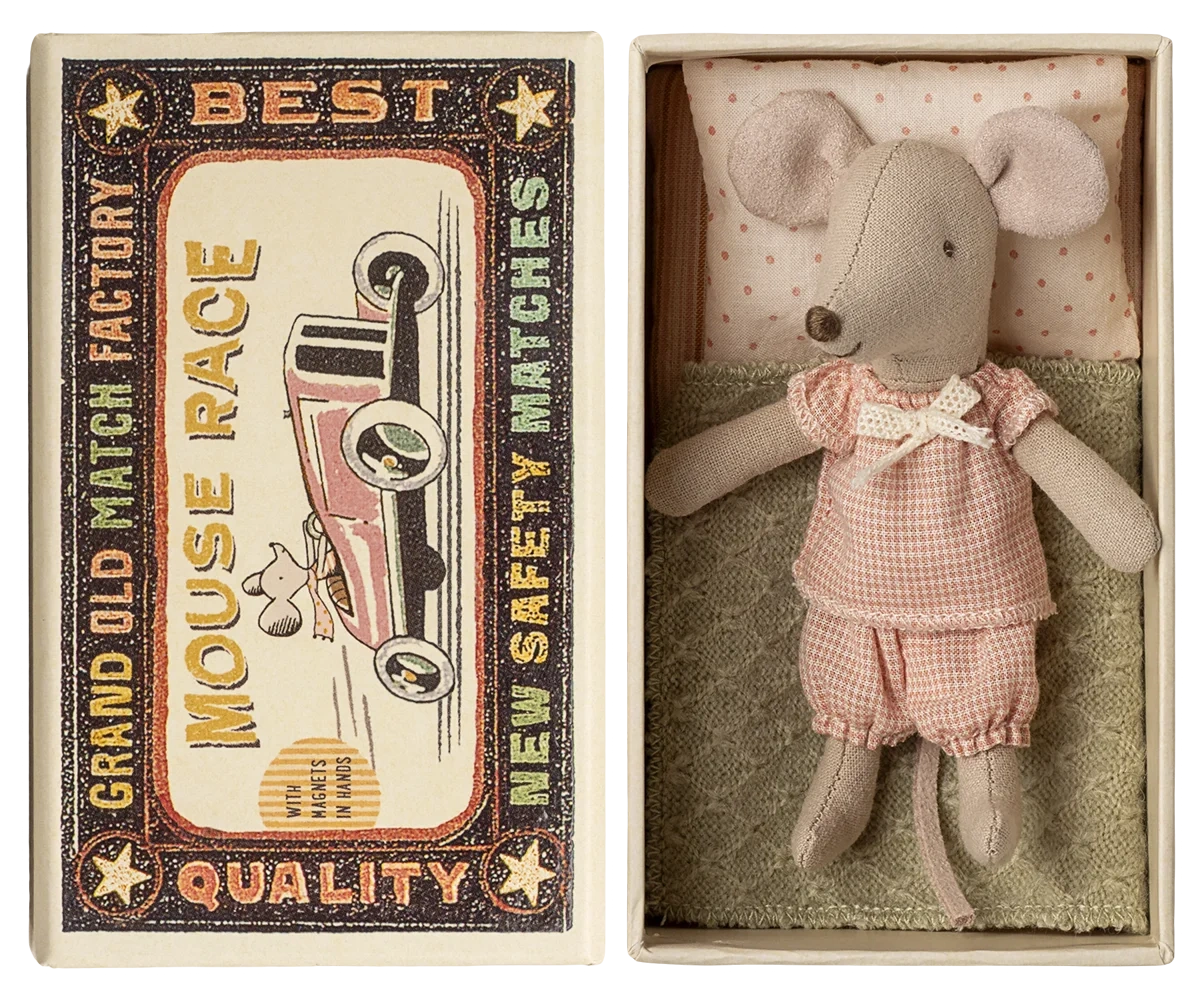 Klasyczny produkt Maileg, ta myszka jest gotowa na wiele godzin zabawy i śpi spokojnie w swoim małym pudełku zapałek. Ubranka i pościel są wykonane z miękkich tkanin z unikalnymi nadrukami w pięknych kolorach. Myszka ma magnesy w rączkach.