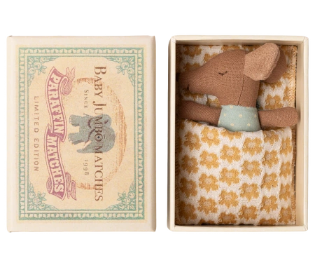 Klasyczny produkt Maileg. Ta myszka jest gotowa na wiele godzin zabawy i śpi smacznie w małym pudełku zapałek. Ubranka i pościel są wykonane z miękkich tkanin z unikalnymi nadrukami w pięknych kolorach.