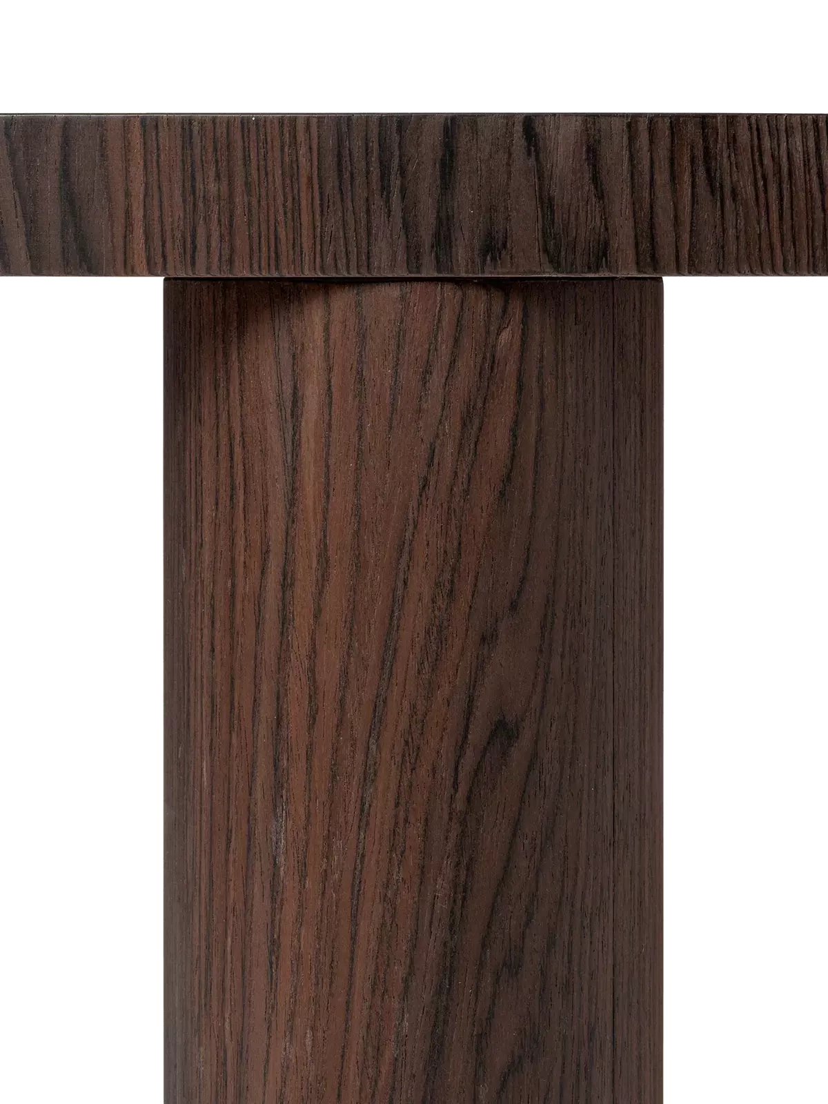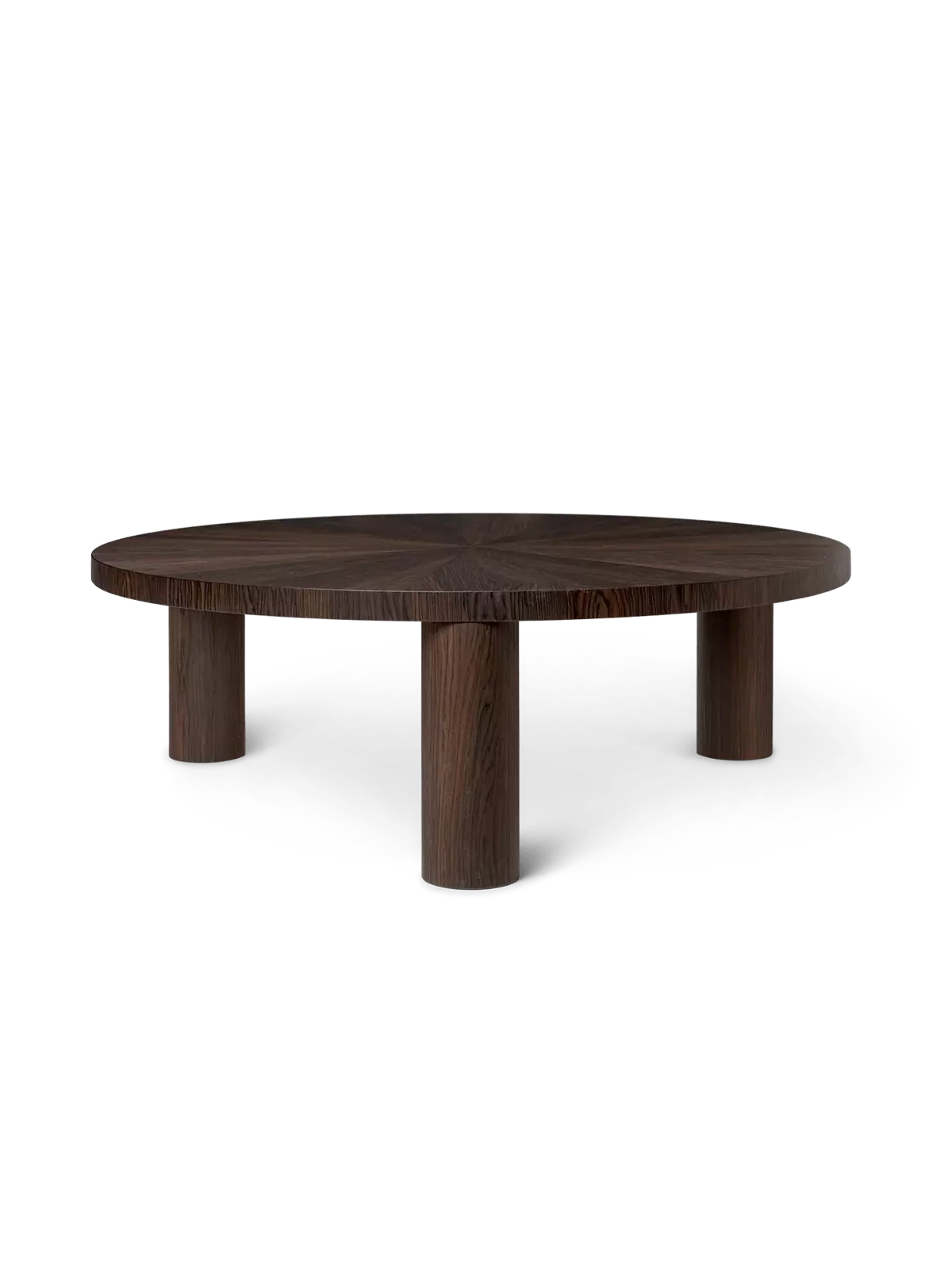 Zainspirowany brutalizmem stolik kawowy Post bawi się objętościami, prezentując prosty, okrągły stolik kawowy z misternymi detalami, które przyciągają. Wykonany z drewna z certyfikatem FSC™ stół ma trzy solidne cylindryczne nogi, a blat ma eleganckie, unikalna boazeria z forniru dębowego w kształcie sektorów kulistych, uzyskana techniką znaną jako intarsja. Użyj kilku stolików w różnych rozmiarach, aby stworzyć spójny krajobraz na dwóch poziomach.