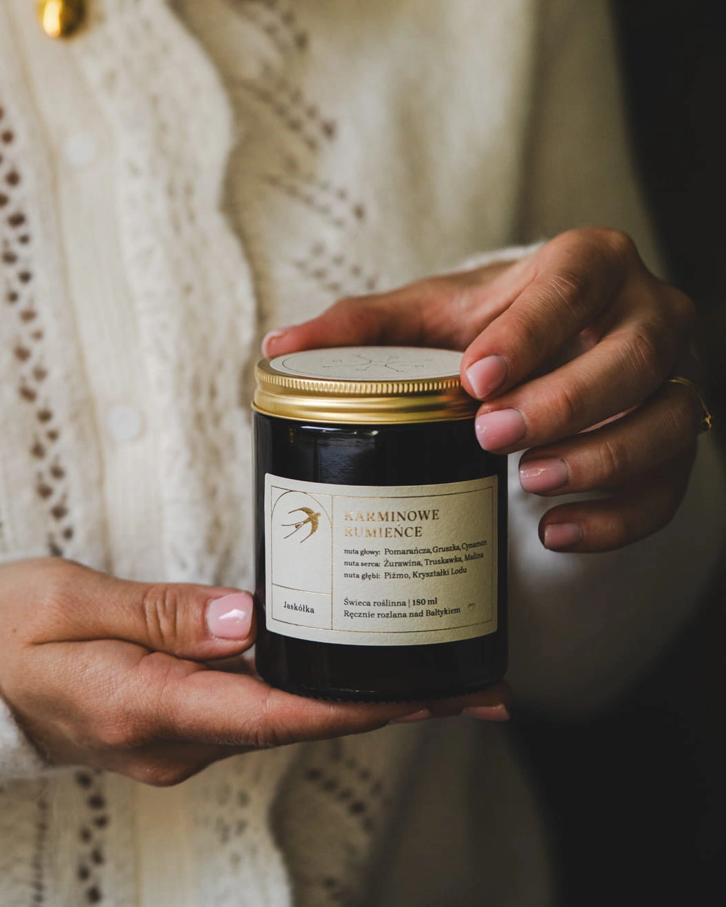 Świeca sojowa Karminowe Rumieńce to zapach radosnego, zimowego dnia, uwieńczonego otulającym rytuałem. Nazwa nawiązuje do zaróżowionych od mrozu policzków, które przypominają płatki róży. Warto skojarzyć ją także z naszą bestsellerową solą kąpielową Pudrowe Perły, inspirowaną luksusowymi kąpielami Marii Antoniny. Różane policzki to przecież jej legendarny znak rozpoznawczy!