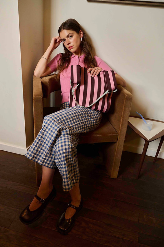 Możesz łatwo odpiąć uchwyt tej pasiastej torby na zakupy, dzięki czemu możesz ją nosić na dwa sposoby! Ale niebieski uchwyt sprawia, że wyróżnia się jeszcze bardziej.