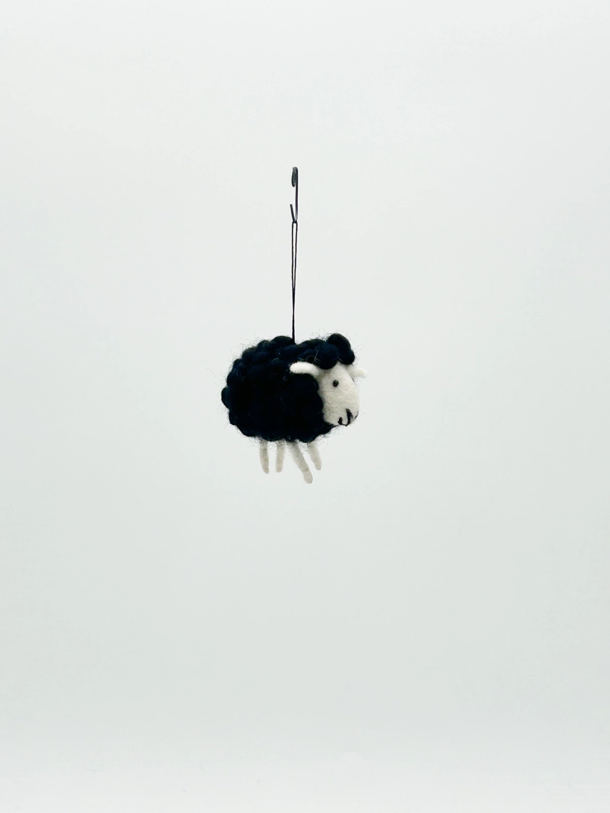 Filcowa figurka wisząca owca z czarnym wełnianym wzorem.